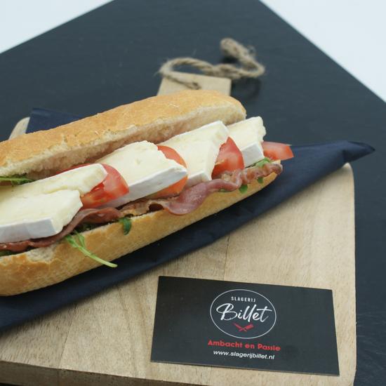 belegd broodje met boter, brie, gebakken spek, tomaat en rucola sla