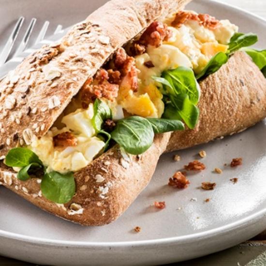 Waldcorn broodje gevuld met eisalade, veldsla en gebakken spekjes